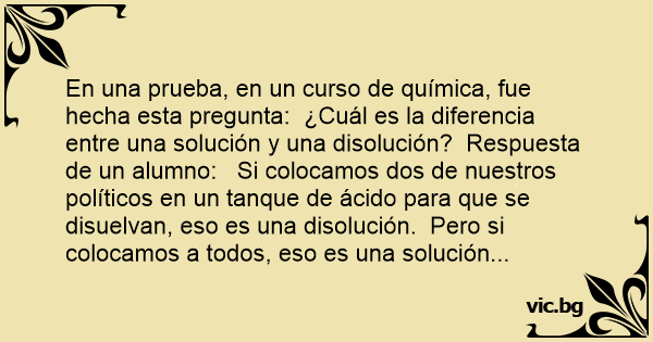 En una prueba, en un curso de química, fue hecha esta pregunta: ¿Cuál es la diferencia entre una solución y una disolución? Respuesta de un alumno: Si colocamos dos de nuestros políticos en un tanque de ácido para que se disuelvan, eso es una disolución. Pero si colocamos a todos, eso es una solución...