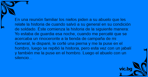 Yo estaba de guardia esa noche, cuando me percaté que se acercaba un rinoceronte a la tienda de campaña de mi General, le disparé, le corté una pierna y me la puse en el hombro, luego se repitió la historia, pero esta vez соn un jabalí y también me la puse en el hombro. Luego el abuelo соn un silencio profundo se queda dormido, los nietos desesperados por el final de la historia despiertan al abuelo de la siguiente manera: