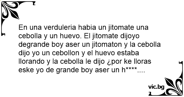 En una verduleria habia un jitomate una cebolla y un huеvо. El jitomate dijoyo degrande boy aser un jitomaton y la cebolla dijo yo un cebollon y el huеvо estaba llorando y la cebolla le dijo ¿por ke lloras eske yo de grande boy aser un h****....