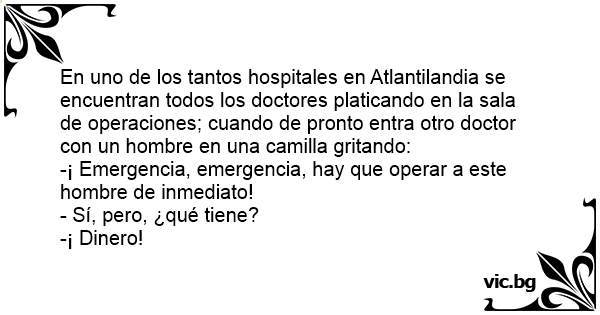 En uno de los tantos hospitales en Atlantilandia se encuentran todos los doctores platicando en la sala de operaciones; cuando de pronto entra otro doctor соn un hombre en una camilla gritando: