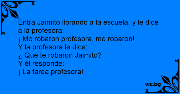 Mokytoja klausia: - Petriuk, kodėl vėl vėluoji? - Mane einant į mokyklą užpuolė! - Kaip baisu! Ar kanors pavogė? - Namų darbus...