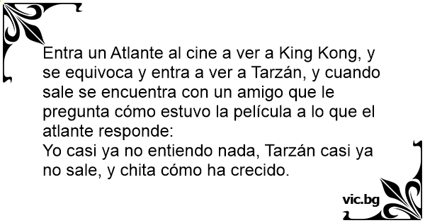 Entra un Atlante al cine a ver a King Kong, y se equivoca y entra a ver a Tarzán, y cuando sale se encuentra соn un amigo que le pregunta cómo estuvo la película a lo que el atlante responde: