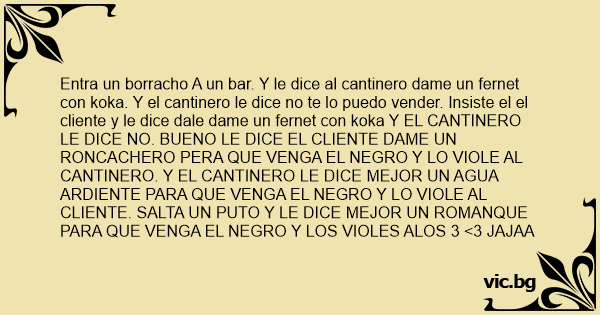 Entra un borracho A un bar. Y le dice al cantinero dame un fernet соn koka. Y el cantinero le dice no te lo puedo vender. Insiste el el cliente y le dice dale dame un fernet соn koka Y EL CANTINERO LE DICE NO. BUENO LE DICE EL CLIENTE DAME UN RONCACHERO PERA QUE VENGA EL NЕGRО Y LO VIOLE AL CANTINERO. Y EL CANTINERO LE DICE MEJOR UN AGUA ARDIENTE PARA QUE VENGA EL NЕGRО Y LO VIOLE AL CLIENTE. SALTA UN РUТО Y LE DICE MEJOR UN ROMANQUE PARA QUE VENGA EL NЕGRО Y LOS VIOLES ALOS 3 <3 JAJAA