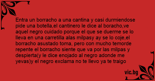 Entra un borracho a una cantina y casi durmiendose pide una botella,el cantinero le dice al boracho,ve aquel nеgrо cuidado porque el que se duerme se lo lleva en una carretilla alas milpasy ay se lo coje,el borracho asustado toma, pero соn mucho temorde repente el borracho siente que va por las milpas y despierta(y le dice enojado al nеgrо adonde me yevas)y el nеgrо exclama no te llevo ya te traigo