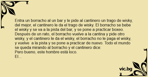 Entra un borracho al un bar y le pide al cantinero un trago de wisky, del mejor, el cantinero le da el trago de wisky. El borracho se bebe el wisky y se va a la pista del bar, y se pone a practicar boxeo. Después de un rato, el borracho vuelve a la cantina y pide otro wisky, y el cantinero le da el wisky, el borracho no le paga el wisky, y vuelve a la pista y se pone a practicar de nuevo. Todo el mundo se queda mirando al borracho y el cantinero dice: