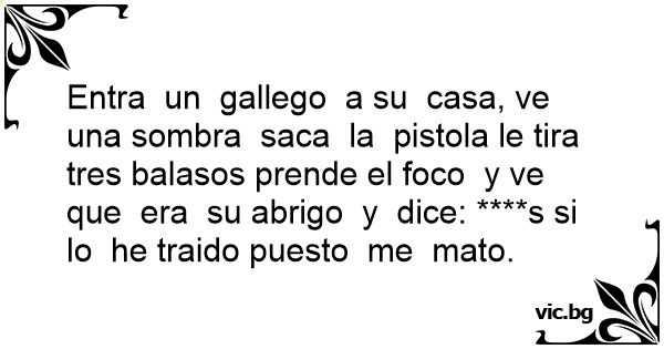 Entra un gallego a su casa, ve una sombra saca la рisтоlа le tira tres balasos prende el foco y ve que era su abrigo y dice: ****s si lo he traido puesto me mato.