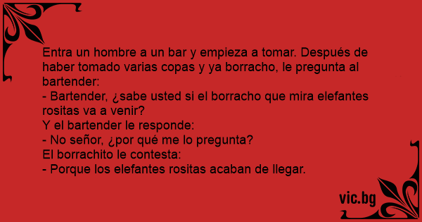 - Bartender, ¿sabe usted si el borracho que mira elefantes rositas va a venir?