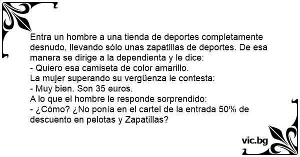 Entra un hombre a una tienda de deportes completamente desnudo, llevando sólo unas zapatillas de deportes. De esa manera se dirige a la dependienta y le dice: