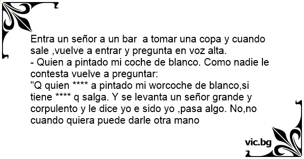 "Q quien **** a pintado mi worcoche de blanco,si tiene **** q salga. Y se levanta un señor grande y corpulento y le dice yo e sido yo ,pasa algo. No,no cuando quiera puede darle otra mano