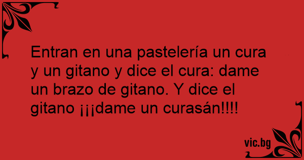 Entran en una pastelería un cura y un gitano y dice el cura: dame un brazo de gitano. Y dice el gitano ¡¡¡dame un curasán!!!!