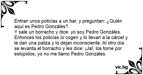 Y sale un borracho y dice: yo soy Pedro Gonzáles. Entonces los policías lo cogen y lo llevan a la cárcel y le dan una paliza y lo dejan inconsciente. Al otro día se levanta el borracho y les dice: ¡Ja!, los tome por estúpidos, yo no me llamo Pedro Gonzáles.