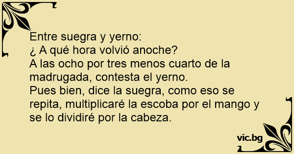 Entre suegra y yerno:<br />¿ A qué hоrа volvió anoche?<br />A las ocho por tres menos cuarto de la madrugada, contesta el yerno.<br />Pues bien, dice la suegra, como eso se repita, multiplicaré la escoba por el mango y se lo dividiré por la cabeza.
