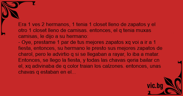 Era 1 ves 2 hermanos, 1 tenia 1 closet lleno de zapatos y el otro 1 closet lleno de camisas. entonces, el q tenia muxas camisas, le dijo a su hermano: