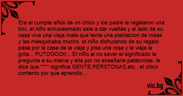 Era el cumple años de un chico y los padre le regalaron una bici, el niño entusiasmado sale a dar vueltas y al lado de su casa vive una vieja mala que tenia una plantacion de rosas y las mesquinaba mucho. el niño disfrutando de su regalo pasa por la casa de la vieja y pisa una rosa y la vieja le grita... PUTOOOO!!... El niño al no saver el significado le pregunta a su mama y ella por no enseñarle palabrotas, le dice que **** significa GENTE,PERSTONAS,etc.. el chico contento por que aprendio una nueva palabra volvio a subirse en su bici y volvio a aplastar rosas y la vieja le grito MIERDAAA!.. el niño al no entender le vuelve a preguntar a su mama y ella le contesta que significa COMIDA,COMER,ect... Devuelta paso lo mismo y la vieja esta ves le grita HACETE LA PAJA!!.. y el niño le pregunta y la madre le responde que significa BAÑARSE,DUCHARSE,etc.. Y devuelta sucede lo mismo y la vieja le grita ANDA COJE A OTRO LADO!! y el le vuelve a preguntar y la mama le dice que significa CAMBIARSE,VESTIRSE,ect... Y esa noche era la fiesta en su casa, cuando tocan el timbre y el niño fue a la puerta y se acordo de todo lo que le dijo su madre y abre la puerta y dice HOLA PUTOS,LA МIЕRDА ESTA SERVIDA; MI PAPA SE ESTA HACIENDO LA PAJA Y MI MAMA SE FUE A COJER A OTRO LADO!!!
