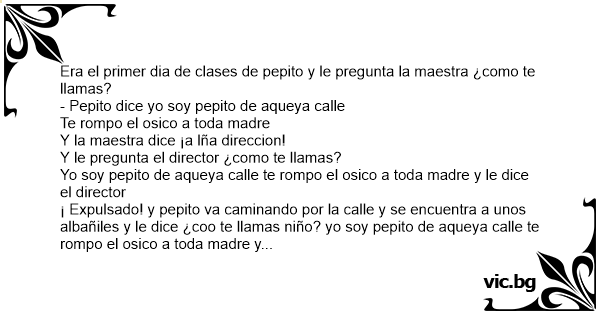 ¡ Expulsado! y pepito va caminando por la calle y se encuentra a unos albañiles y le dice ¿coo te llamas niño? yo soy pepito de aqueya calle te rompo el osico a toda madre y el albañil le dice niño ¡bete соn dios! y dios le dice ¿como te llamas? yo soy pepito de aqueya calle te rompo el osico a toda madre y dios le dice ¡al infierno!y el diablo le dice ¿comote llamas?