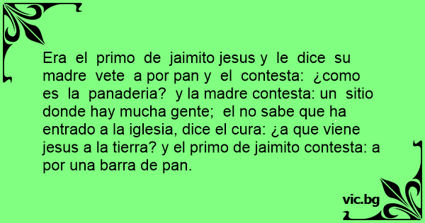 Era el primo de jaimito jesus y le dice su madre vete a por pan y el contesta: ¿como es la panaderia? y la madre contesta: un sitio donde hay mucha gente; el no sabe que ha entrado a la iglesia, dice el cura: ¿a que viene jesus a la tierra? y el primo de jaimito contesta: a por una barra de pan.