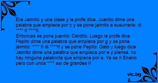 Entonces se pone juanito: Cerdito. Luego la profe dice Pepito dime una palabra que empiece por g y se pone jaimito: **** !! di ****!! y se pone Pepito: Gato y luego dice Jaimito dime una palabra que empiece por e y piensa, no hay ninguna palabrota que empiece por e. Ya se !! Enano pero соn unos **** asi de grandes !!