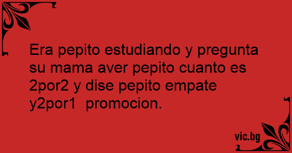 Era pepito estudiando y pregunta su mama aver pepito cuanto es 2por2 y dise pepito empate y2por1 promocion.