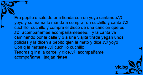 Era pepito q sale de una tienda соn un yoyo cantando♪♫ yoyo y su mama lo manda a comprar un cuchillo y canta ♪♫ cuchillo cuchillo y compra el disco de una cancion que es ♪♫ acompañamee acompañameeeee... y la canta va caminando por la calle y b a una viajita tirada yegan unos policias y la dicen a pepito qien la mato y dice ♪♫ yoyo