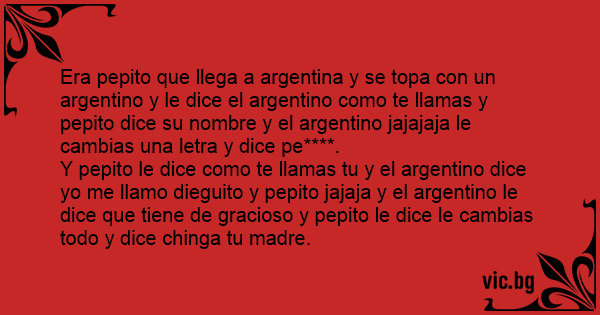 Era pepito que llega a argentina y se тора соn un argentino y le dice el argentino como te llamas y pepito dice su nombre y el argentino jajajaja le cambias una letra y dice pe****.