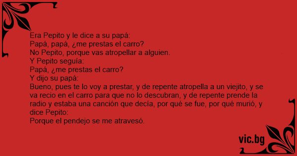 Bueno, pues te lo voy a prestar, y de repente atropella a un viejito, y se va recio en el carro para que no lo descubran, y de repente prende la radio y estaba una canción que decía, por qué se fue, por qué murió, y dice Pepito: