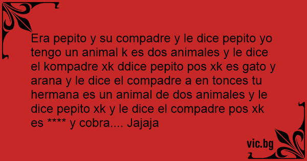 Era pepito y su compadre y le dice pepito yo tengo un animal k es dos animales y le dice el kompadre xk ddice pepito pos xk es gato y arana y le dice el compadre a en tonces tu hermana es un animal de dos animales y le dice pepito xk y le dice el compadre pos xk es **** y cobra...