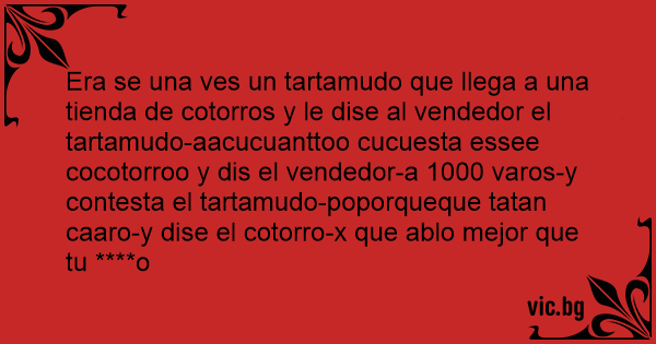 Era se una ves un tartamudo que llega a una tienda de cotorros y le dise al vendedor el tartamudo-aacucuanttoo cucuesta essee cocotorroo y dis el vendedor-a 1000 varos-y contesta el tartamudo-poporqueque tatan caaro-y dise el cotorro-x que ablo mejor que tu ****o