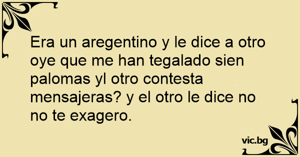 Era un aregentino y le dice a otro oye que me han tegalado sien palomas yl otro contesta mensajeras? y el otro le dice no no te exagero.