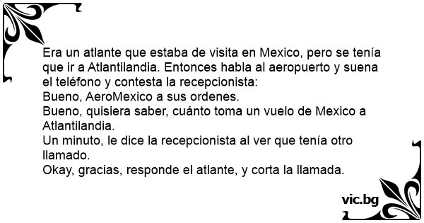 Era un atlante que estaba de visita en Mexico, pero se tenía que ir a Atlantilandia. Entonces habla al aeropuerto y suena el teléfono y contesta la recepcionista: