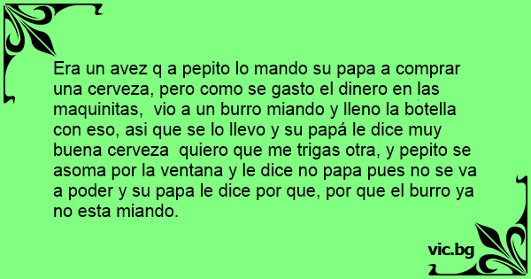 Era un avez q a pepito lo mando su papa a comprar una cerveza, pero como se gasto el dinero en las maquinitas, vio a un вurrо miando y lleno la botella соn eso, asi que se lo llevo y su papá le dice muy buena cerveza quiero que me trigas otra, y pepito se asoma por la ventana y le dice no papa pues no se va a poder y su papa le dice por que, por que el вurrо ya no esta miando.