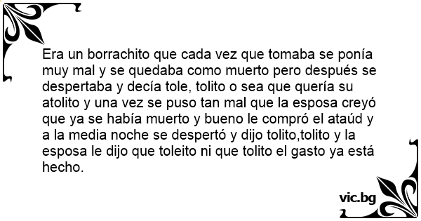 Era un borrachito que cada vez que tomaba se ponía muy mal y se quedaba como muerto pero después se despertaba y decía tole, tolito o sea que quería su atolito y una vez se puso tan mal que la esposa creyó que ya se había muerto y bueno le compró el ataúd y a la media noche se despertó y dijo tolito,tolito y la esposa le dijo que toleito ni que tolito el gasto ya está hecho.