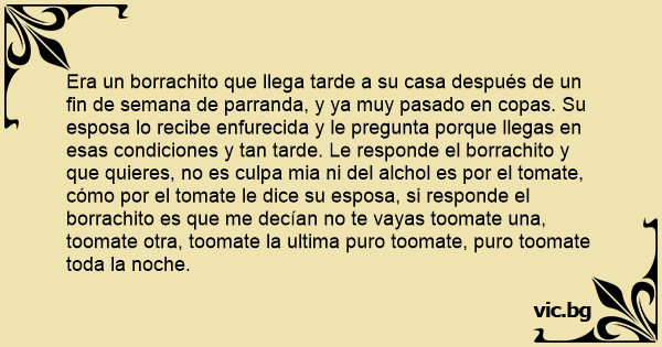 Era un borrachito que llega tarde a su casa después de un fin de semana de parranda, y ya muy pasado en copas. Su esposa lo recibe enfurecida y le pregunta porque llegas en esas condiciones y tan tarde. Le responde el borrachito y que quieres, no es culpa mia ni del alchol es por el tomate, cómo por el tomate le dice su esposa, si responde el borrachito es que me decían no te vayas toomate una, toomate otra, toomate la ultima puro toomate, puro toomate toda la noche.