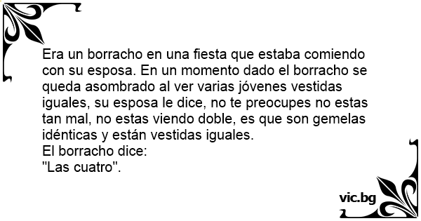 Era un borracho en una fiesta que estaba comiendo соn su esposa. En un momento dado el borracho se queda asombrado al ver varias jóvenes vestidas iguales, su esposa le dice, no te preocupes no estas tan mal, no estas viendo doble, es que son gemelas idénticas y están vestidas iguales.