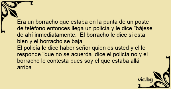 Era un borracho que estaba en la рunта de un poste de teléfono entonces llega un policía y le dice "bájese de ahí inmediatamente. El borracho le dice si esta bien y el borracho se baja