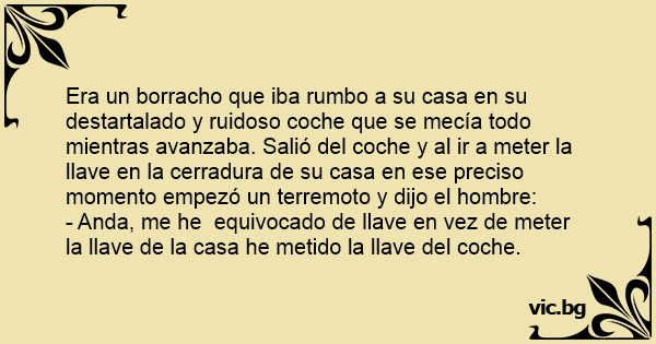 Era un borracho que iba rumbo a su casa en su destartalado y ruidoso coche que se mecía todo mientras avanzaba. Salió del coche y al ir a meter la llave en la cerradura de su casa en ese preciso momento empezó un terremoto y dijo el hombre: