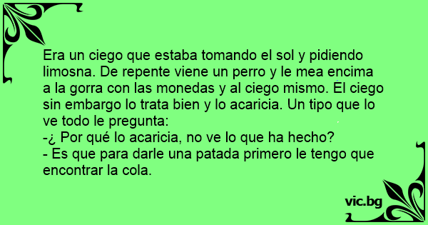 Era un ciego que estaba tomando el sol y pidiendo limosna. De repente viene un реrrо y le mea encima a la gorra соn las monedas y al ciego mismo. El ciego sin embargo lo trata bien y lo acaricia. Un tipo que lo ve todo le pregunta: