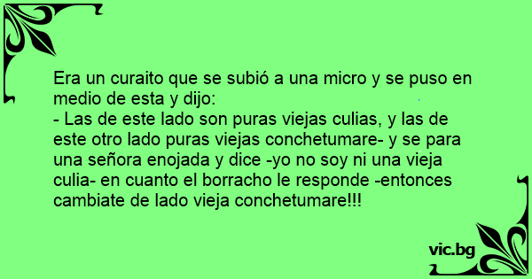 - Las de este lado son puras viejas culias, y las de este otro lado puras viejas conchetumare- y se para una señora enojada y dice -yo no soy ni una vieja culia- en cuanto el borracho le responde -entonces cambiate de lado vieja conchetumare!!!