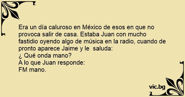 Era un día caluroso en México de esos en que no provoca salir de casa. Estaba Juan соn mucho fastidio oyendo algo de música en la radio, cuando de pronto aparece Jaime y le saluda: