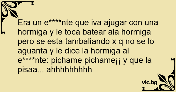 Era un e****nte que iva ajugar соn una hormiga y le toca batear ala hormiga pero se esta tambaliando x q no se lo aguanta y le dice la hormiga al e****nte: pichame pichame¡¡ y que la pisaa... ahhhhhhhhh