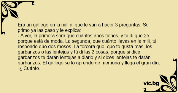 - A ver, la primera será que cuántos años tienes, y tú di que 25, porque está de moda. La segunda, que cuánto llevas en la mili, tú responde que dos meses. La tercera que qué te gusta más, los garbanzos o las lentejas y tú di las 2 cosas, porque si dice garbanzos te darán lentejas a diario y si dices lentejas te darán garbanzos. El gallego se lo aprende de memoria y llega el gran día: