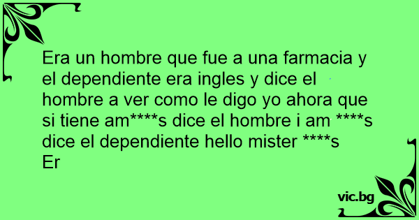 Era un hombre que fue a una farmacia y el dependiente era ingles y dice el hombre a ver como le digo yo ahora que si tiene am****s dice el hombre i am ****s dice el dependiente hello mister ****s