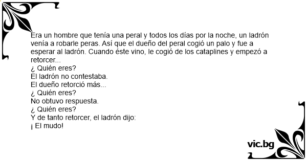 Era un hombre que tenía una peral y todos los días por la noche, un ladrón venía a robarle peras. Así que el dueño del peral cogió un palo y fue a esperar al ladrón. Cuando éste vino, le cogió de los cataplines y empezó a retorcer...