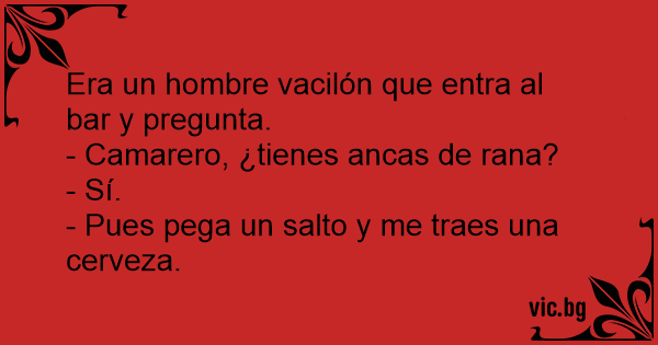 Este es un hombre que va a un bar y pregunta: Camarero, camarero, ¿tiene ancas de rana? El camarero le responde: Sí. Y él dice: Pues das un salto, y me traes una cerveza.