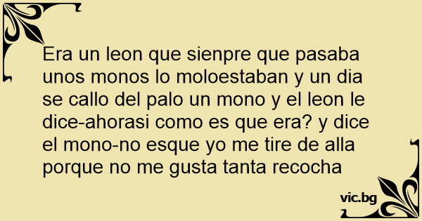 Era un leon que sienpre que pasaba unos monos lo moloestaban y un dia se callo del palo un mono y el leon le dice-ahorasi como es que era? y dice el mono-no esque yo me tire de alla porque no me gusta tanta recocha