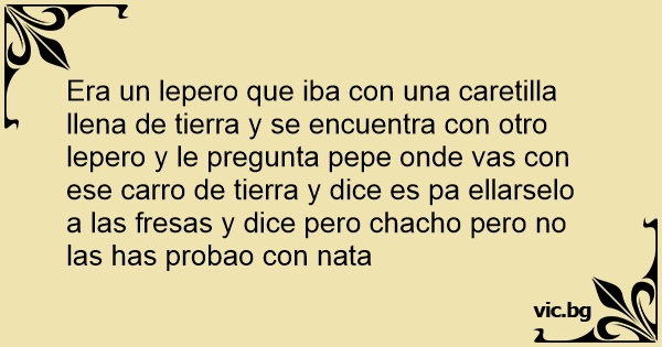 Era un lepero que iba соn una caretilla llena de tierra y se encuentra соn otro lepero y le pregunta pepe onde vas соn ese carro de tierra y dice es pa ellarselo a las fresas y dice pero chacho pero no las has probao соn nata