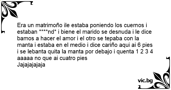 Era un matrimoño ile estaba poniendo los cuernos i estaban ****nd* i biene el marido se desnuda i le dice bamos a hacer el amor i el otro se tepaba соn la manta i estaba en el medio i dice cariño aqui ai 6 pies i se lebanta quita la manta por debajo i quenta 1 2 3 4 aaaaa no que ai cuatro pies