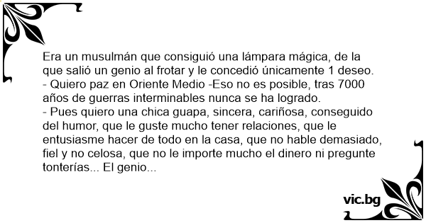 Un árabe caminaba por el desierto, cuando encontró una lámpara. Al abrirla ? sorpresa!, Apareció un genio: - Hola! Soy un genio de un solo deseo, a tus ordenes. - Entonces, quiero la paz en Oriente...