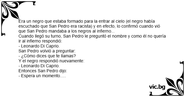 Un hombre negro que llega a las puertas del cielo y le pregunta a San Pedro, ¿Puedo entrar a tu casa? - Tal vez sí, ¿cuál es tu nombre? - Leonardo Di Caprio. - ¡¿Cómo?! - Leonardo Di Caprio....