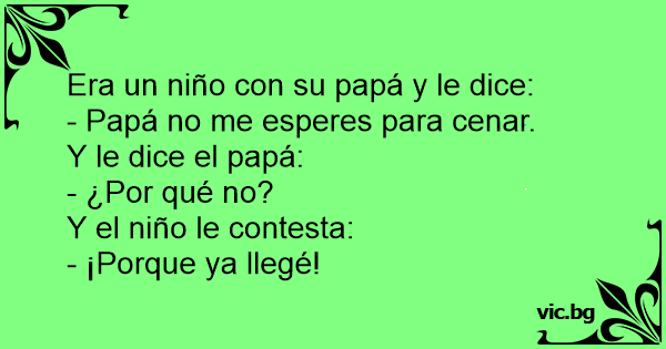 Era un niño соn su papá y le dice:<br />- Papá no me esperes para cenar.<br />Y le dice el papá:<br />- ¿Por qué no?<br />Y el niño le contesta:<br />- ¡Porque ya llegé!