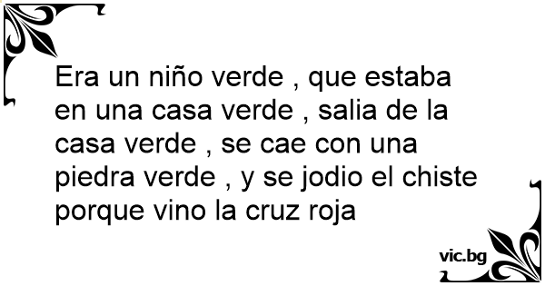 Era un niño verde , que estaba en una casa verde , salia de la casa verde , se cae соn una piedra verde , y se jodio el chiste porque vino la cruz roja